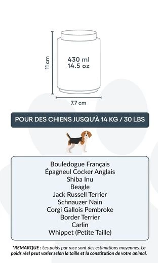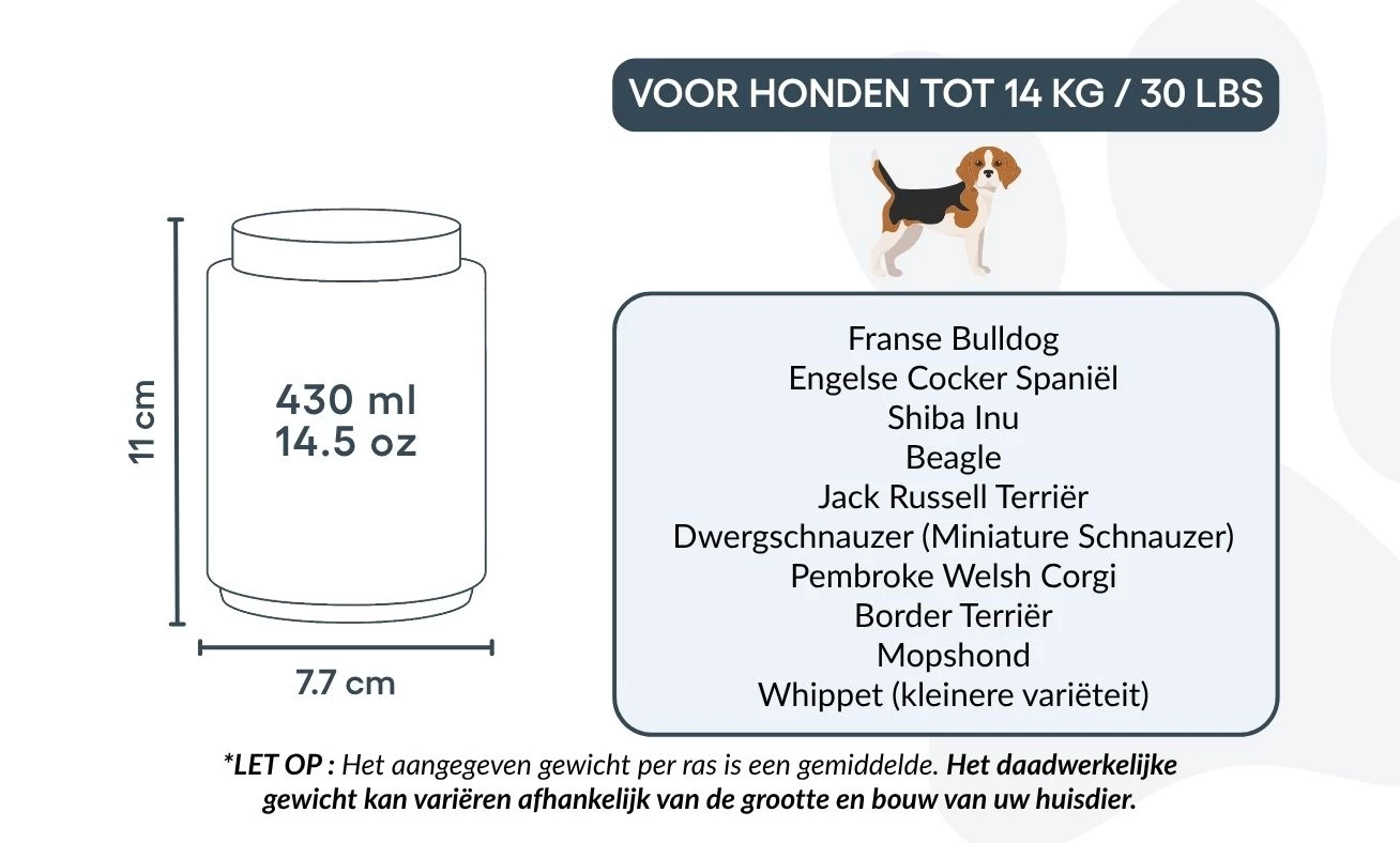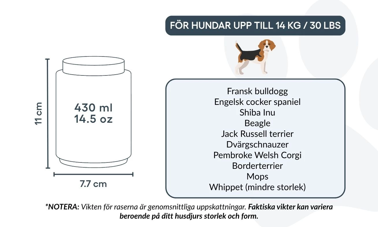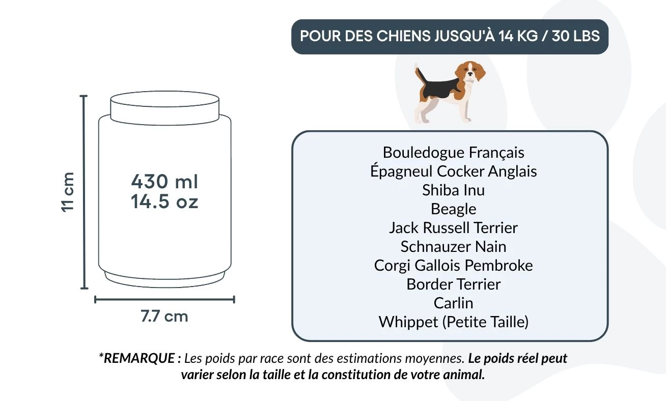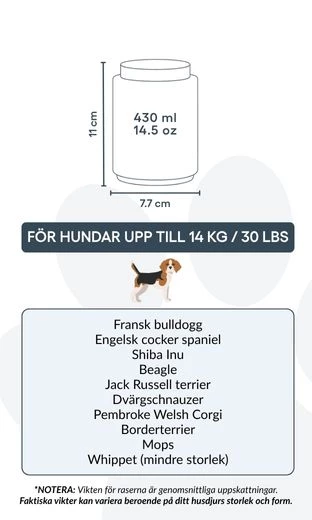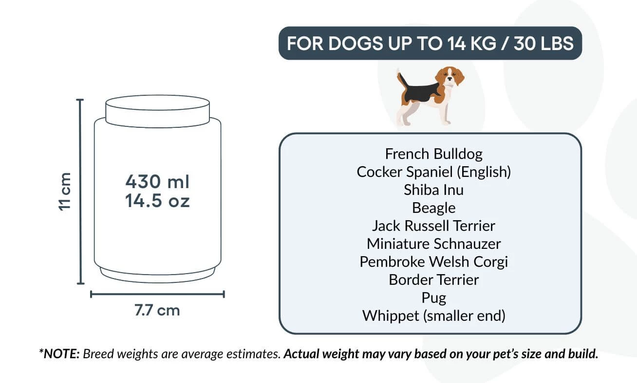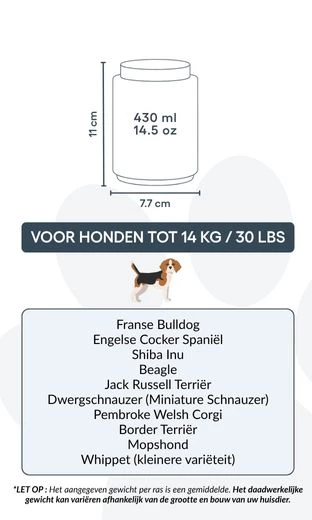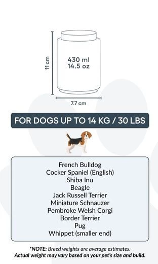 Small: 7.7 cm (W) x 11 cm (H) x 7.7 cm (L) | 430ml / 14.5 oz | for dogs up to 14kg / 30lbs