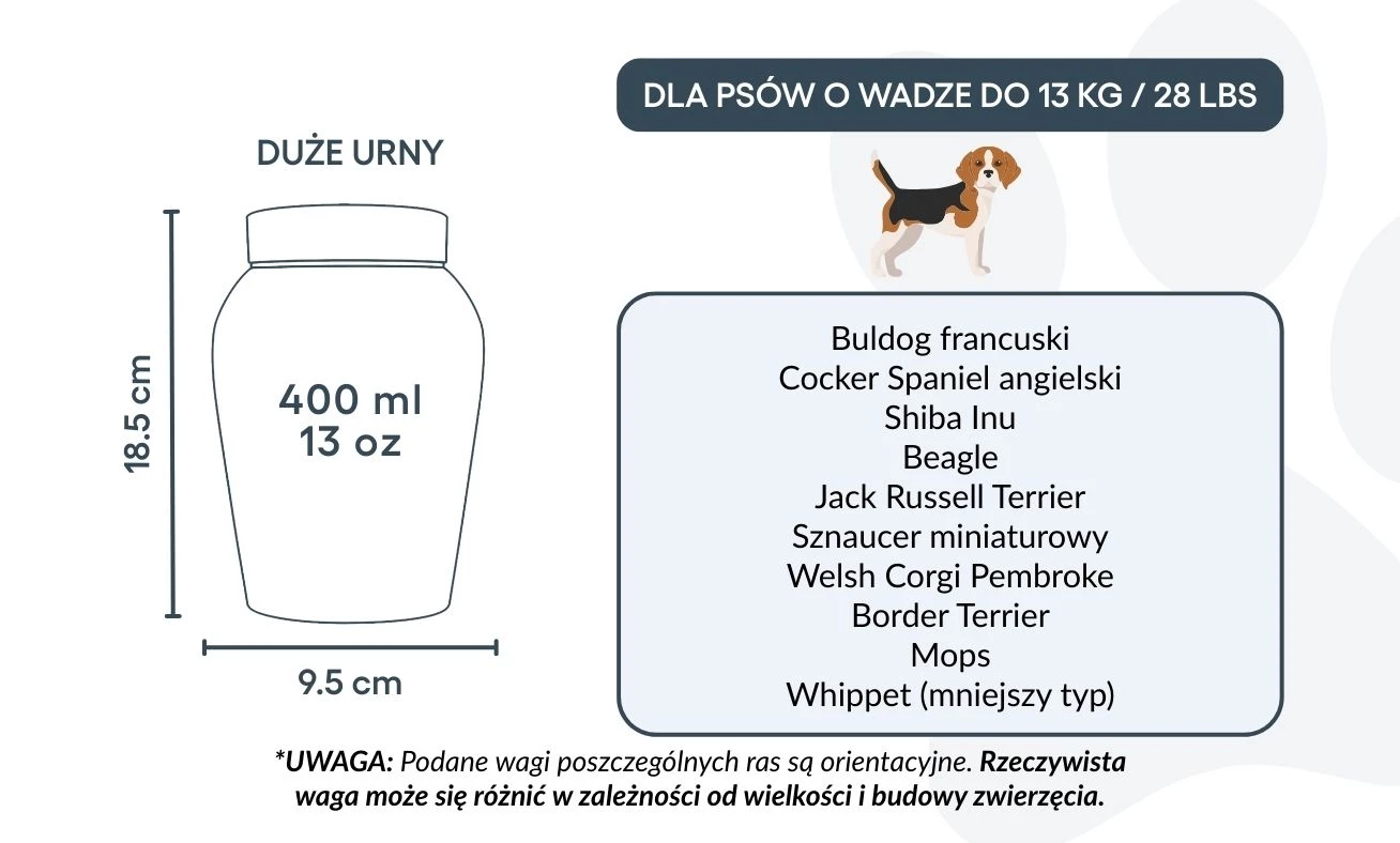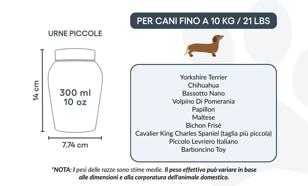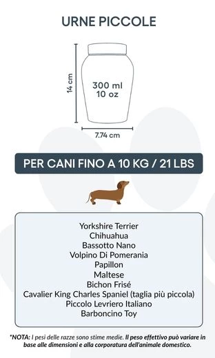Ideal for pet cremation and dog ashes, this memorial urn is available in two sizes to accommodate small to large-sized dogs. With a secure closure and custom design, it serves as both a protective casket and a comforting symbol of your pet’s place in your heart.
