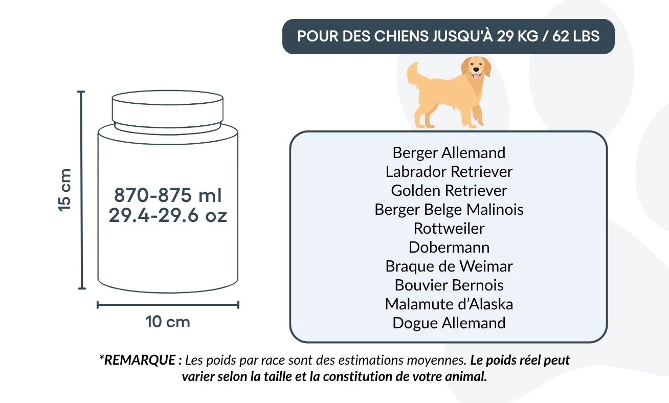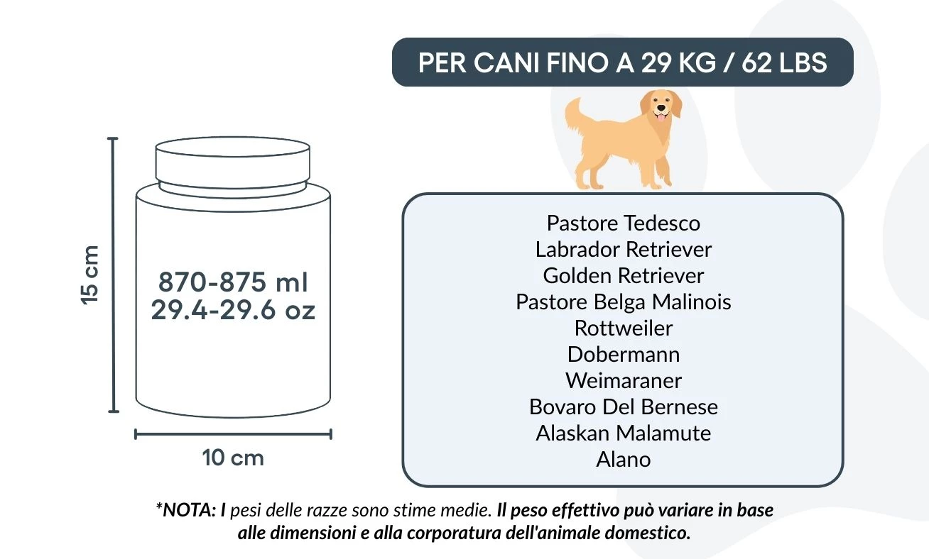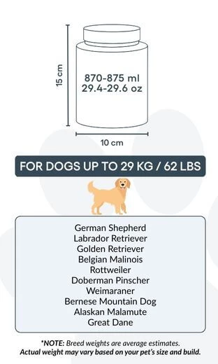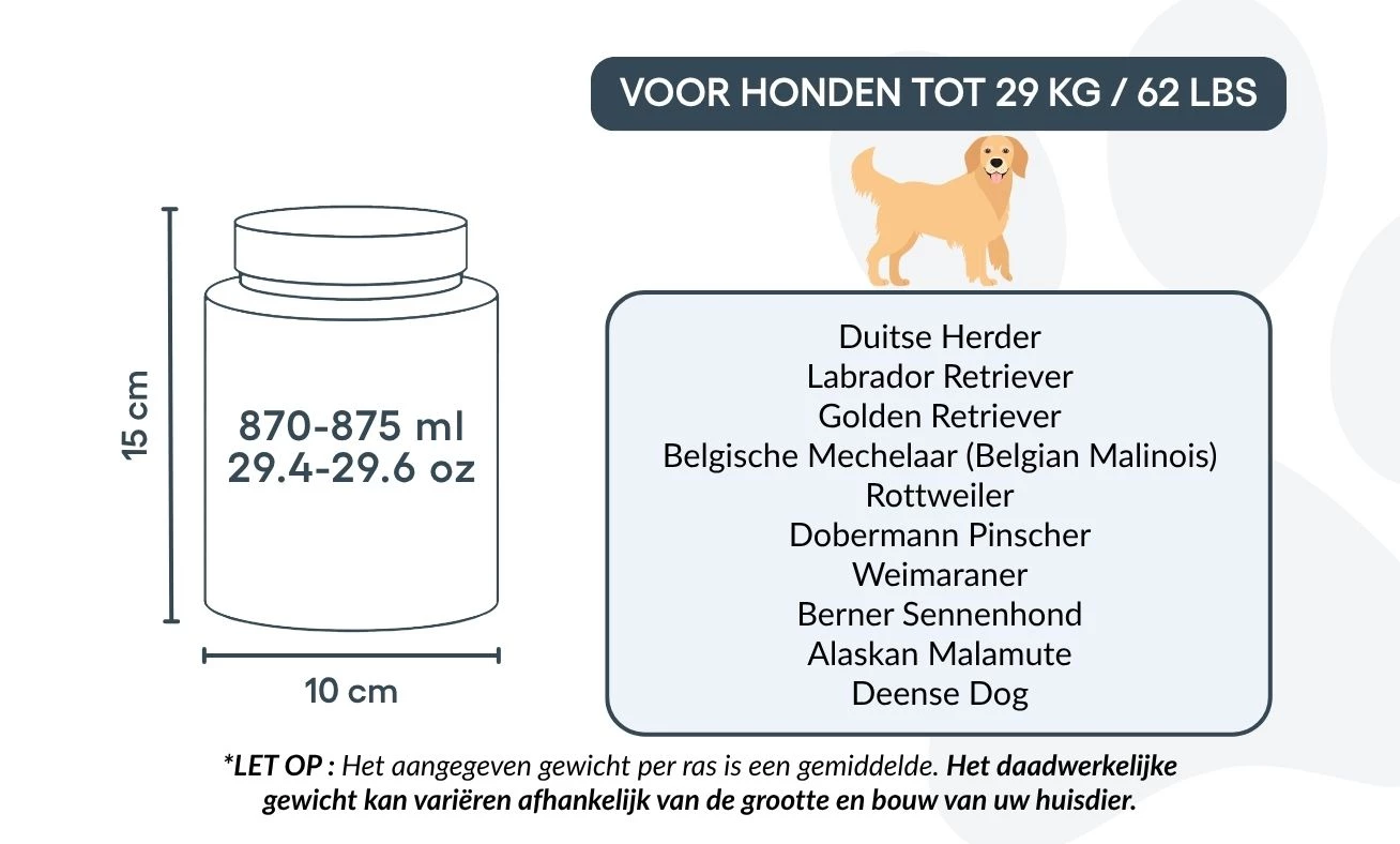 Small: 10 cm (W) x 15 cm (H) x 10 cm (L) | 870–875 ml / 29.4-29.6 oz - suitable for dogs up to approx. 29 kg / 62 lbs