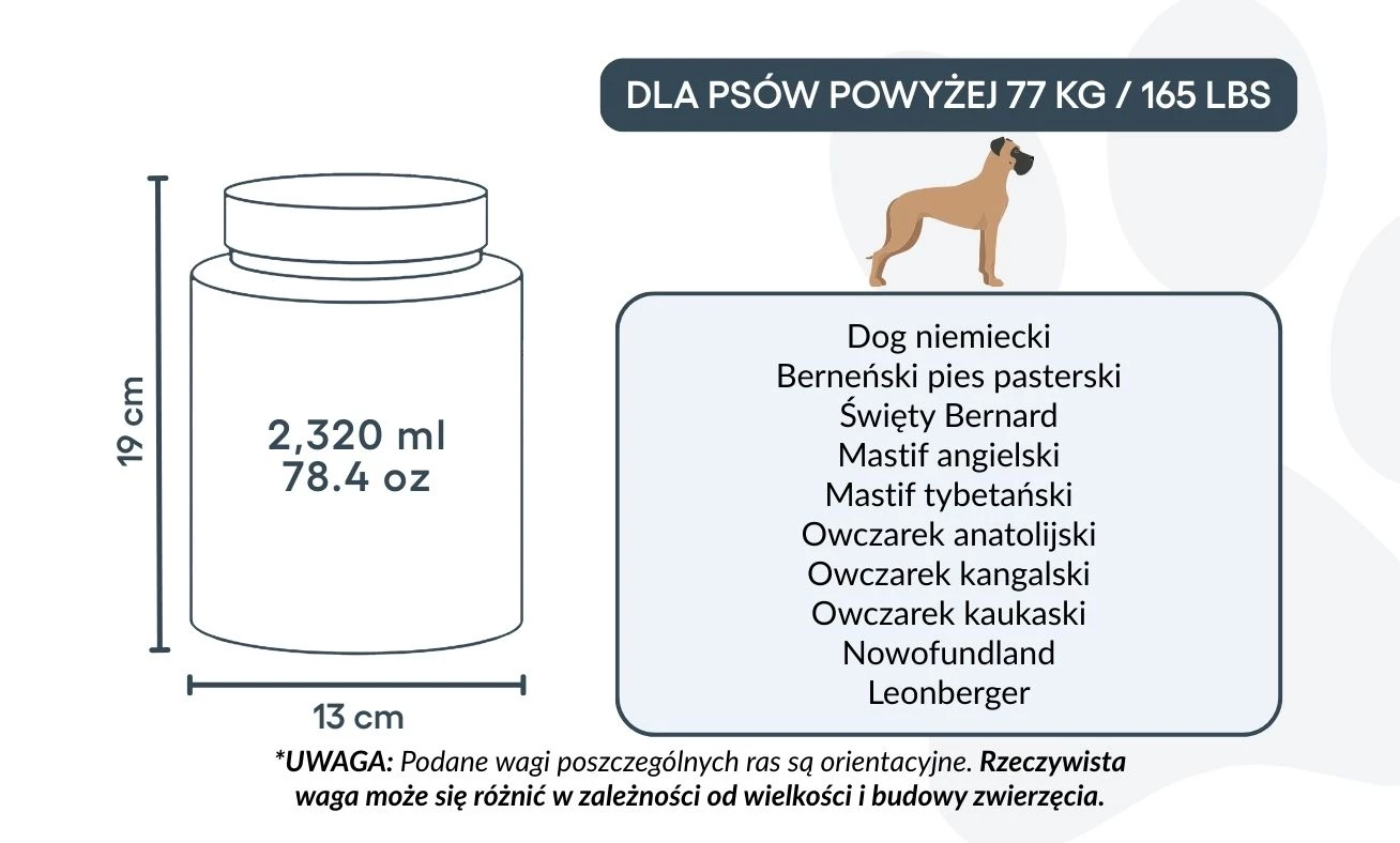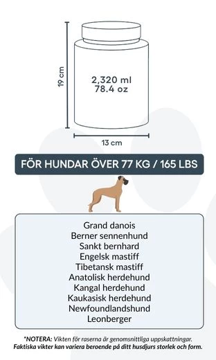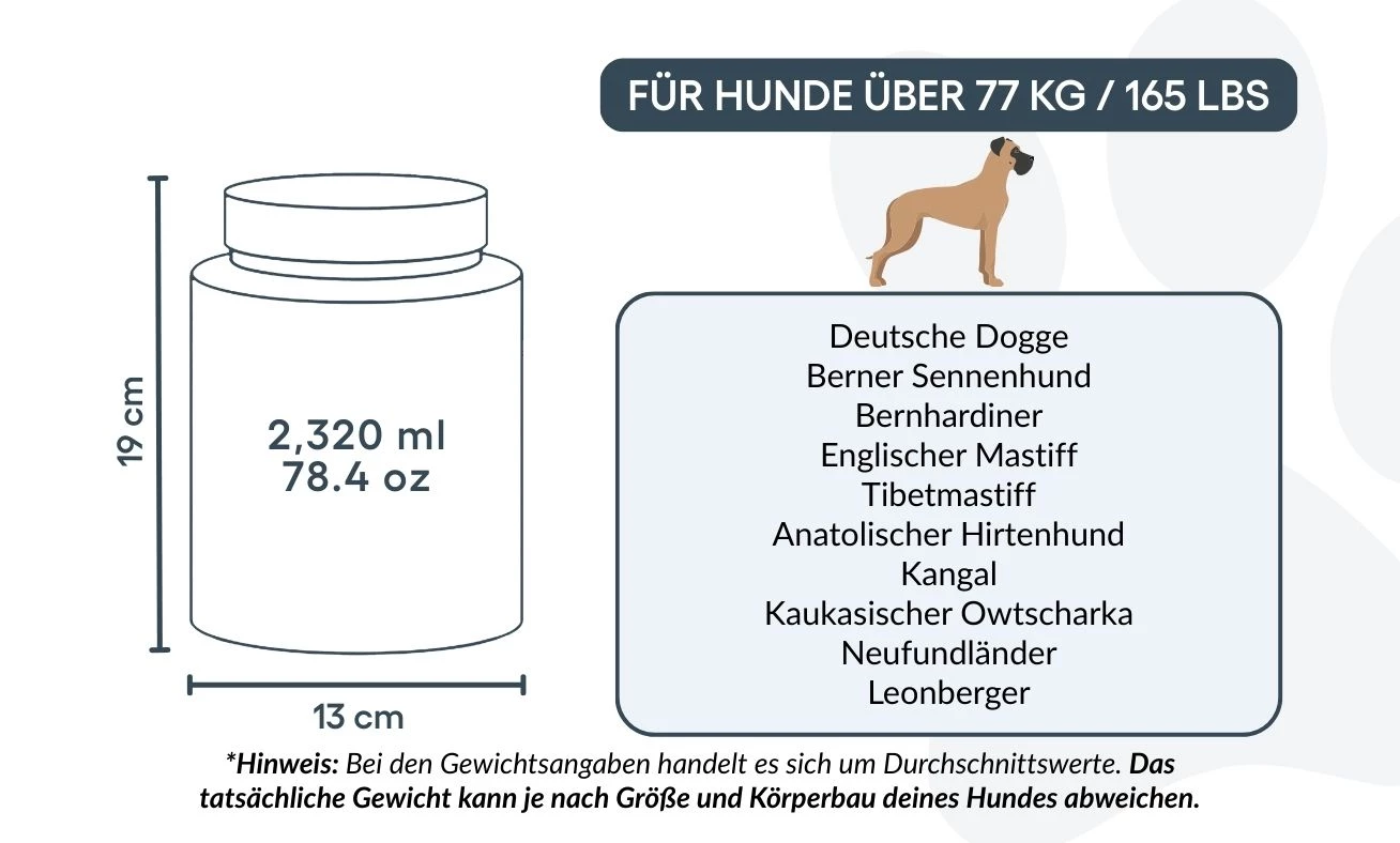 Large: 13 cm (W) x 19 cm (H) x 13 cm (L) | ~2,320 ml / 78.4 oz – suitable for dogs up to approx. 77 kg / 165 lbs