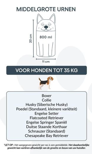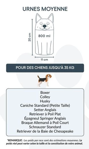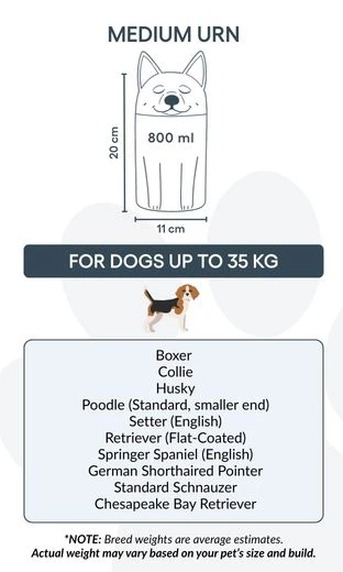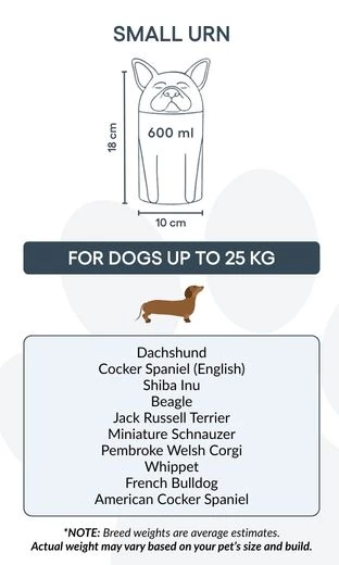 This dog urn is available in three sizes to suit different breeds and weights, and can be personalised with your dog’s name and meaningful text. From terriers and chihuahuas to collies, this unique cremation urn is designed to reflect your pet’s individuality.