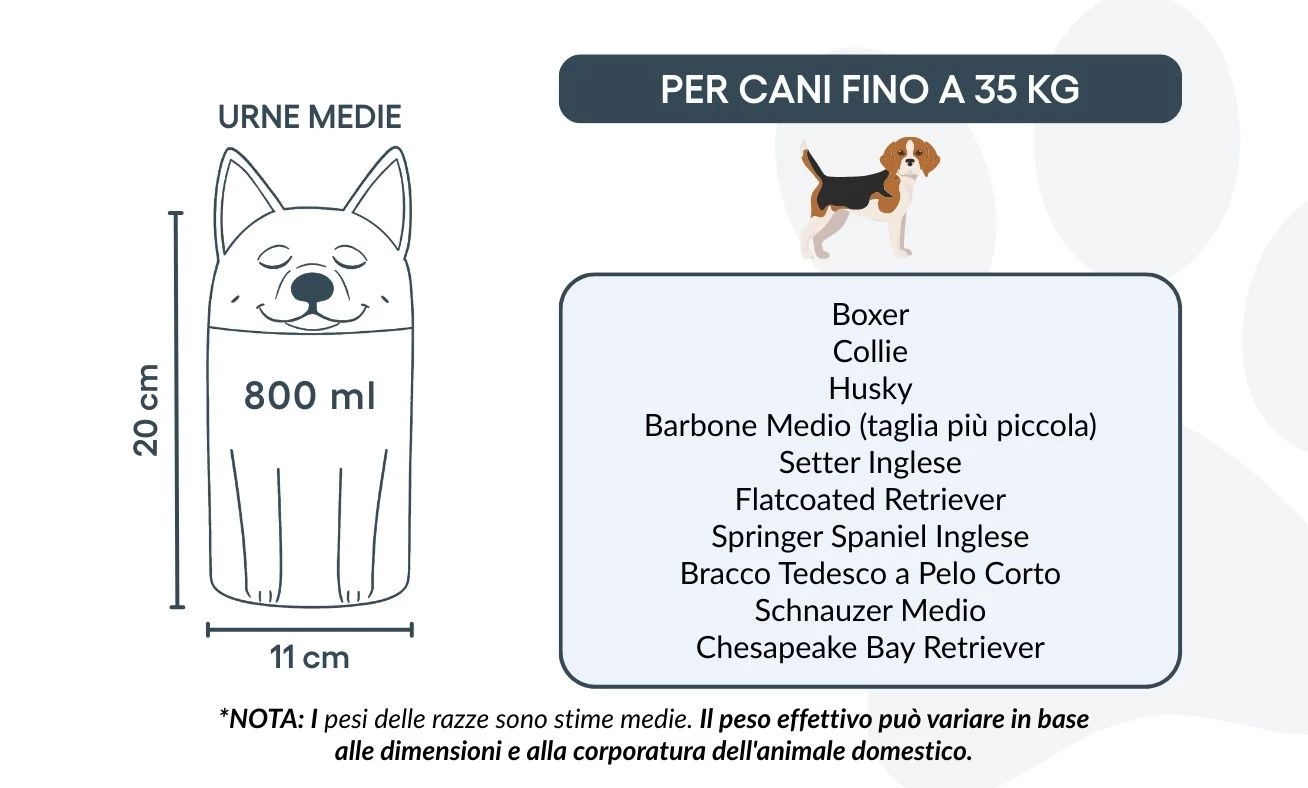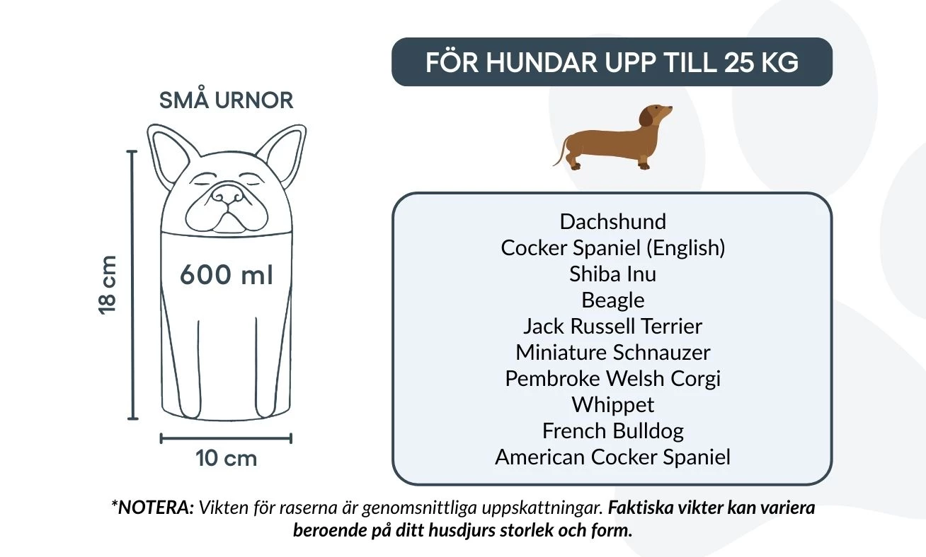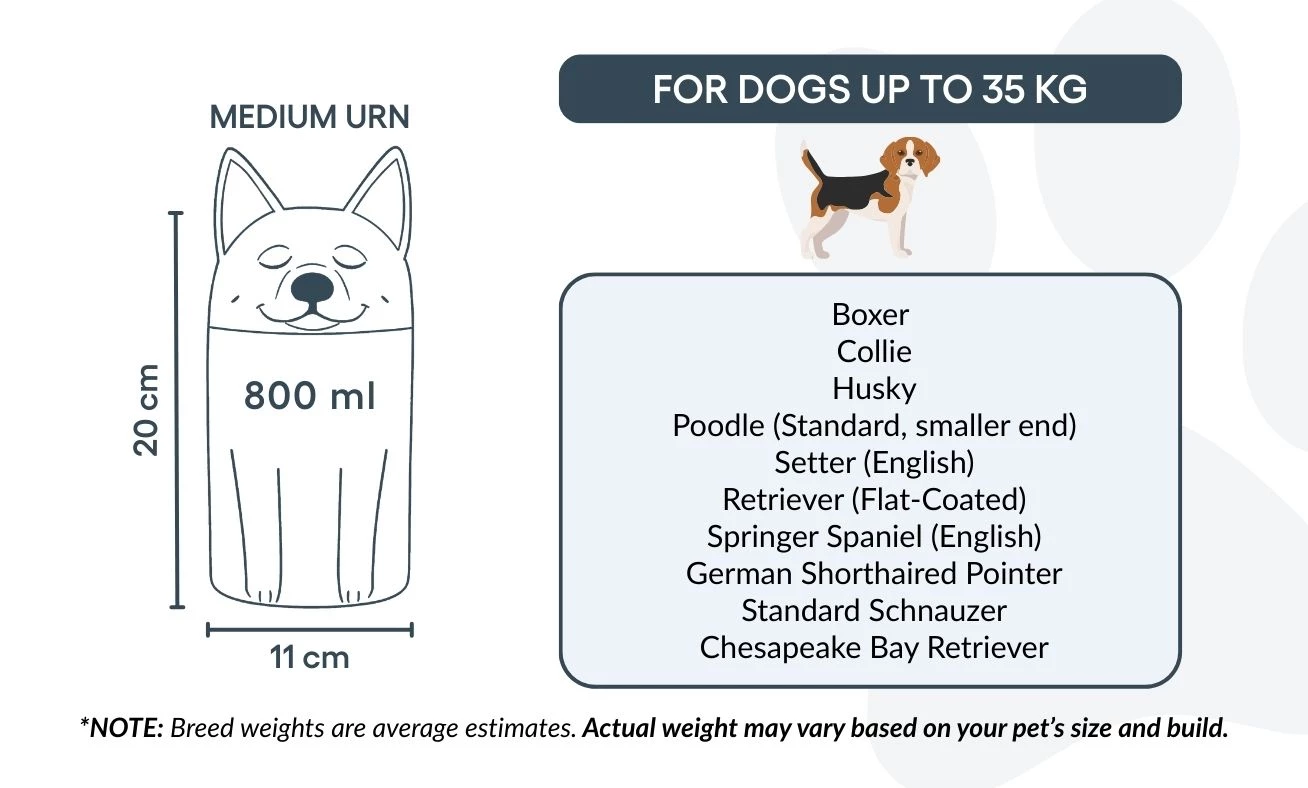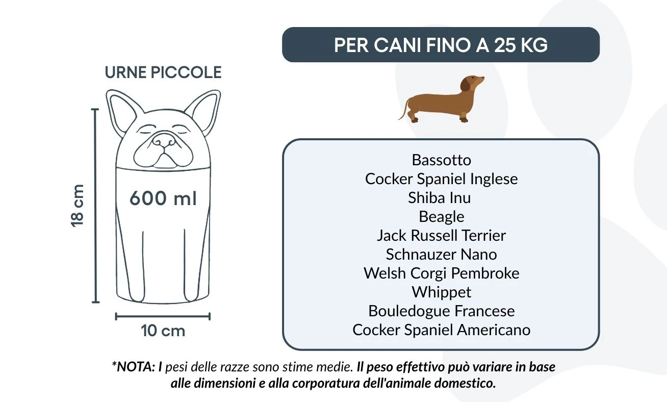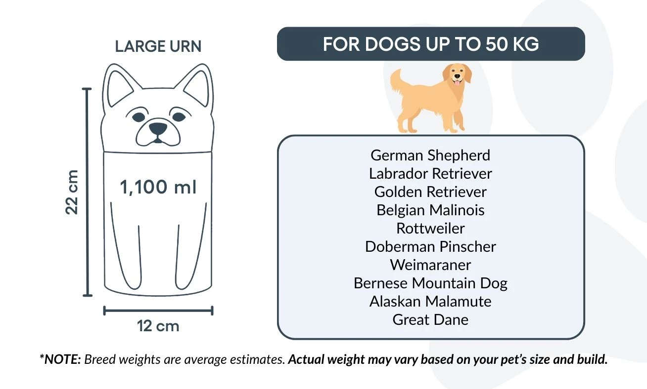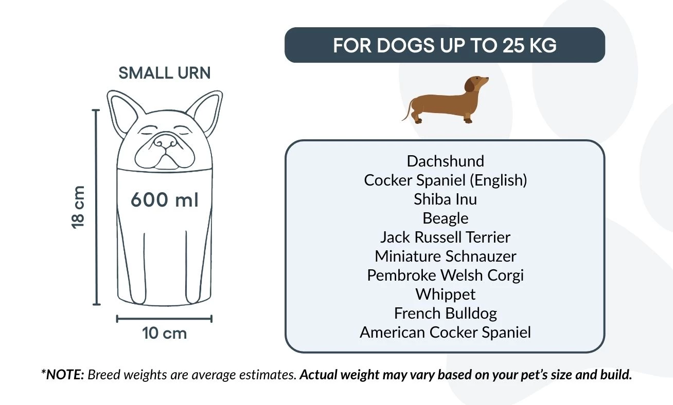 Note: Volume estimates are based on average pet cremation yields. Please consider your pet’s weight and build when choosing an urn.