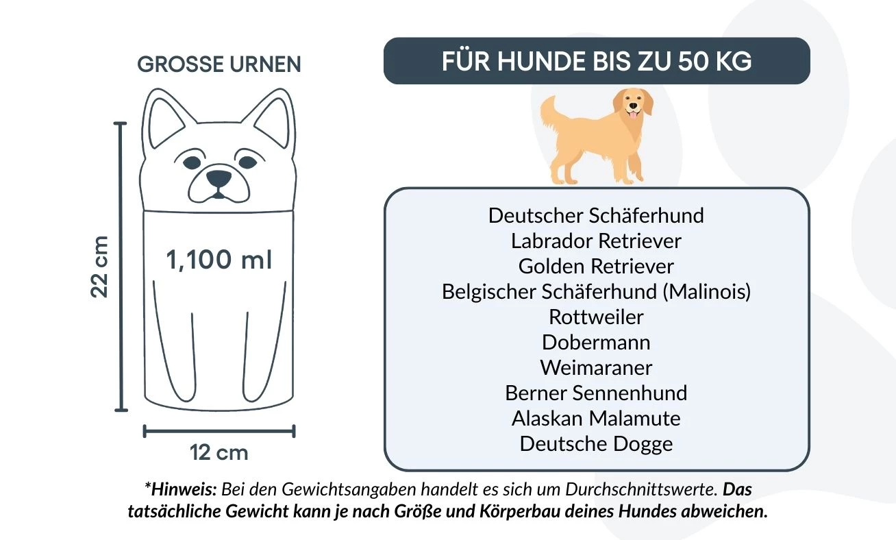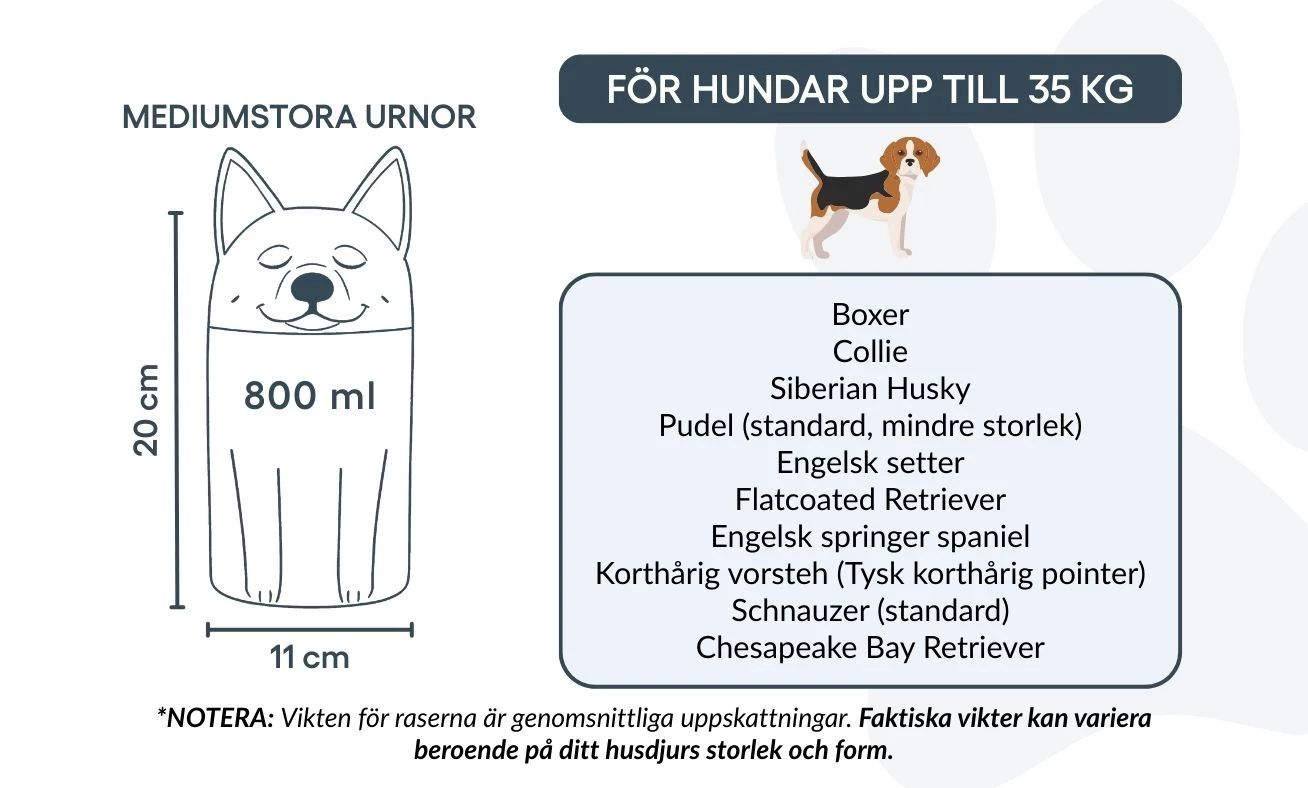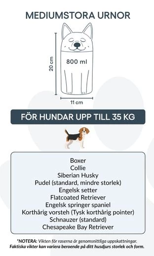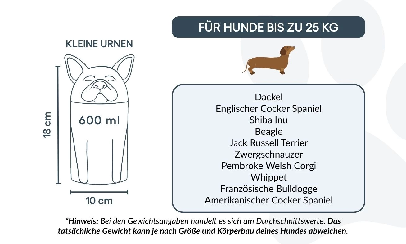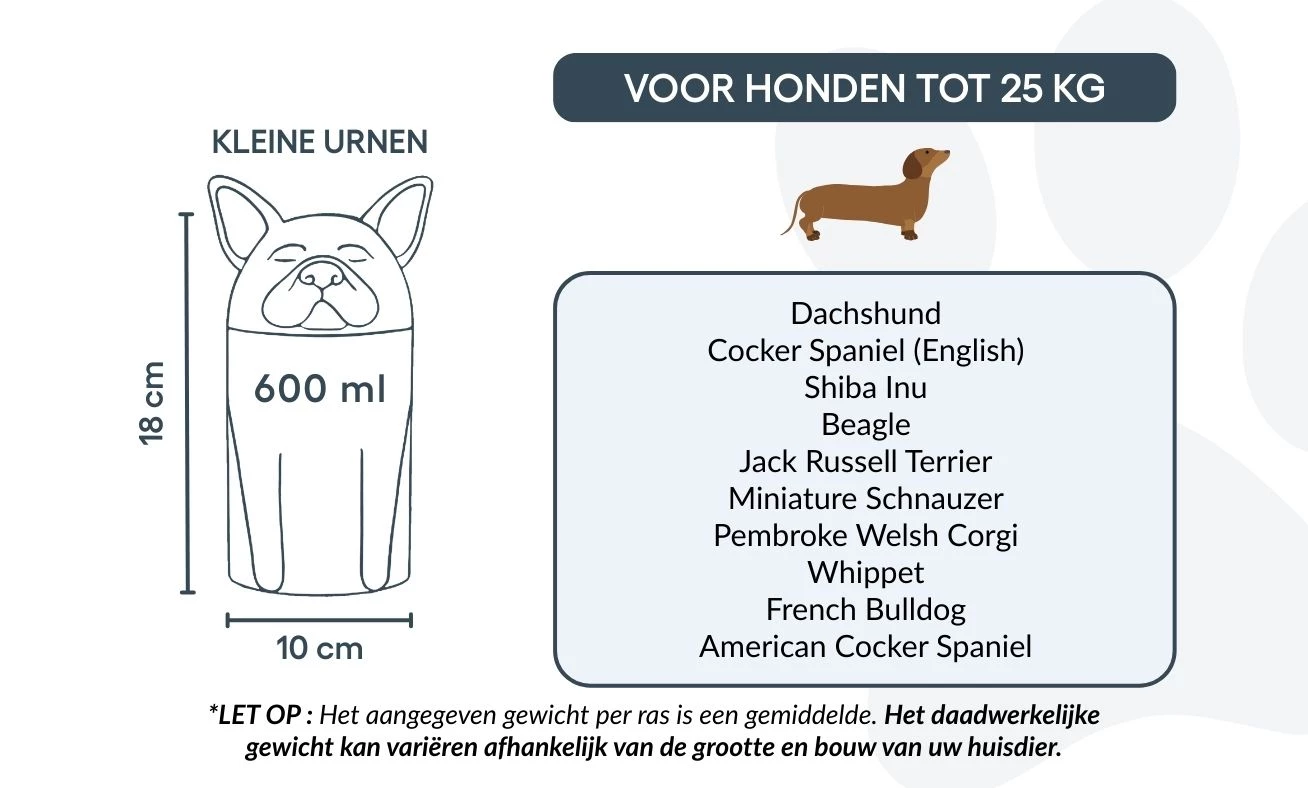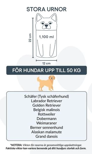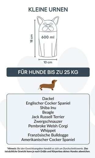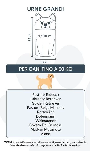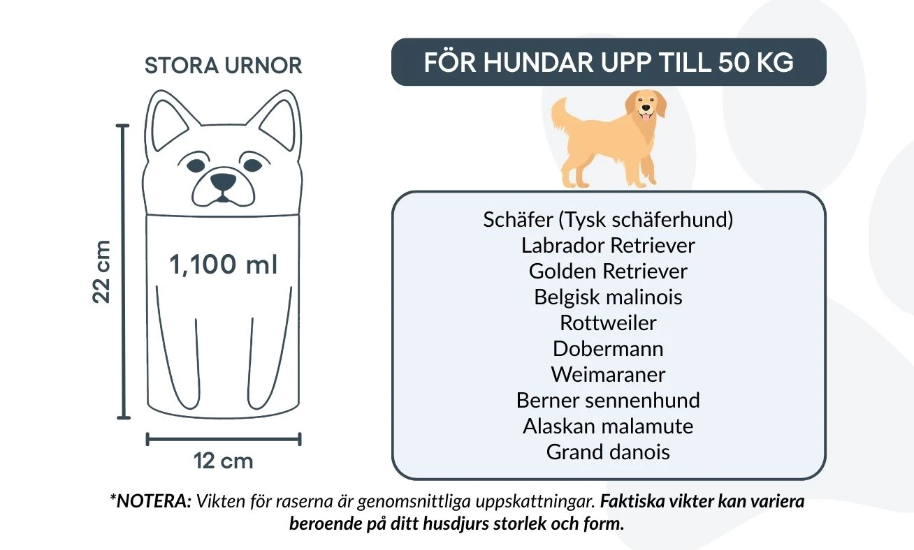 Note: Volume estimates are based on average pet cremation yields. Please consider your pet’s weight and build when choosing an urn.