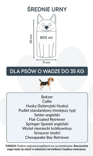 Medium: 11 cm W x 20 cm H | ~800 ml | For dogs up to 35 kg