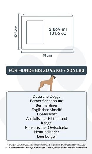 Size / Urn Capacity: 18 cm (L) x 12.2 cm (W) x 12.5 cm (H) | ~2,869 ml / 175 cubic inches / 101.6 oz | for dogs up to 95 kg / 204 lbs