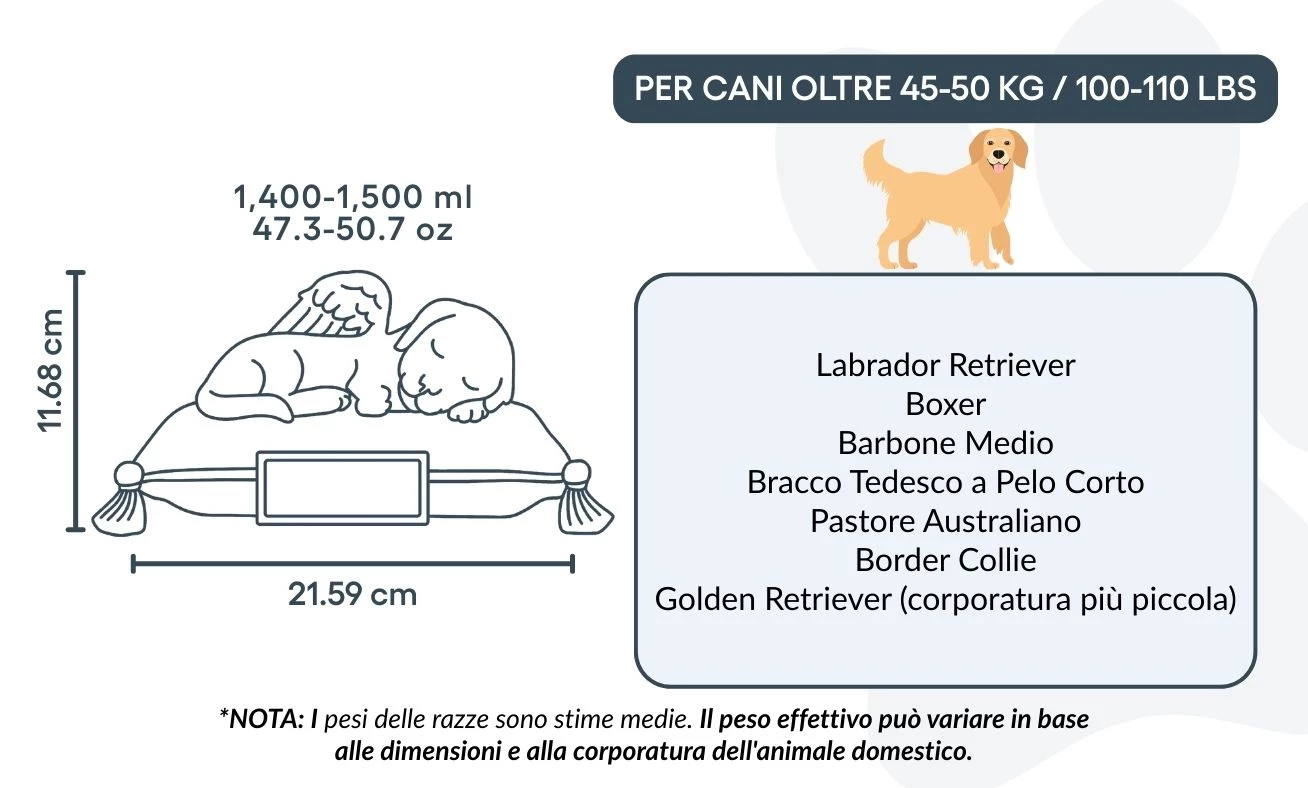 Note: Volume estimates are based on average pet cremation yields. Please consider your pet’s weight and build when choosing an urn.